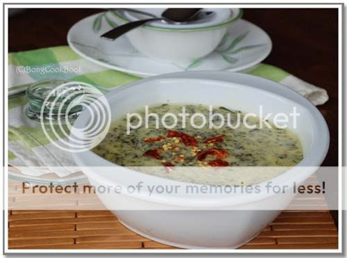 She said "Cook Spinach with green chillis and little rice in the Pressure cooker. Beat Yogurt with chickpea flour till there are no lumps. Season the yogurt with salt and red chili powder. Add the yogurt to the cooked spinach and rice and mix well. Add a pat of butter and enjoy the dish"